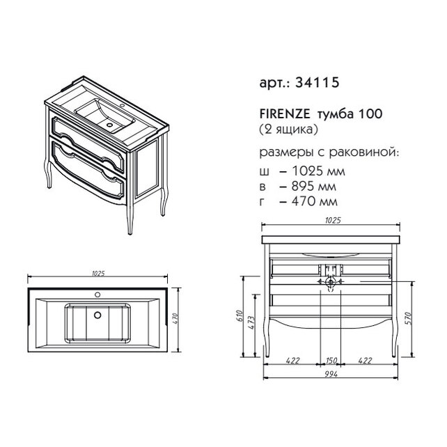- Габаритные размеры тумба + раковина, ш/г/в, в см: 102,5/ 47/ 89,5