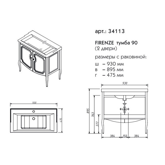 - Габаритные размеры тумба + раковина, ш/г/в, в см: 93/ 46,8/ 89,5