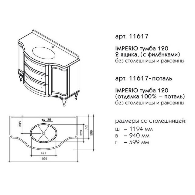 - Габаритные размеры тумба + столешница, ш/г/в, в см: 119,4/ 59,9/ 94
