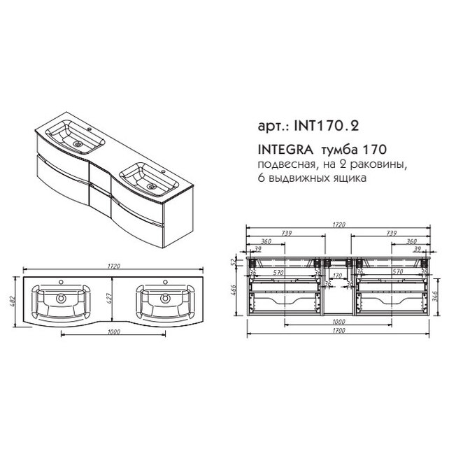 - Габаритные размеры тумба + стеклянная раковина, ш/г/в, в см: 172/ 48,2/ 54,8