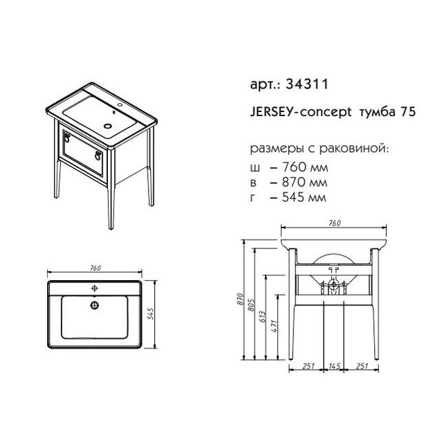 - Габаритные размеры тумба + раковина, ш/г/в, в см: 76/ 54,5/ 87