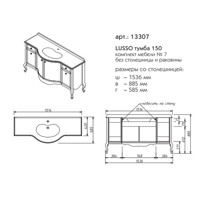 - Габаритные размеры тумба + столешница, ш/г/в, в см: 153,6/ 58,5/ 89,5