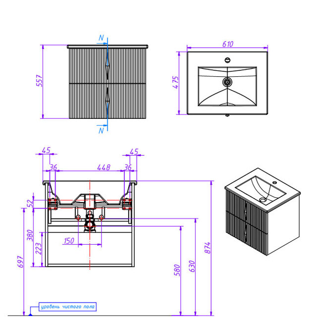 - Габаритные размеры тумба + раковина, ш/г/в, в см: 61/47,5/55,7