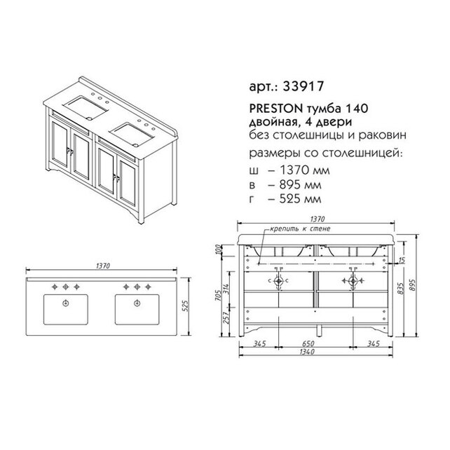 - Габаритные размеры тумба + раковина, ш/г/в, в см: 137/ 52,5/ 88,5