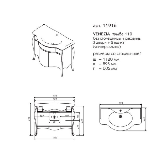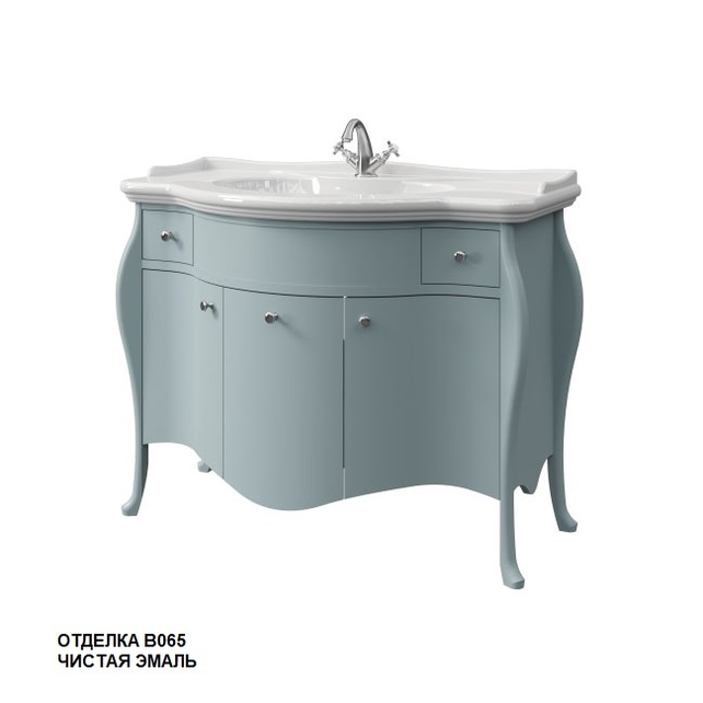 Тумба с раковиной VENEZIA 110 выпускается в отделках из Реестра отделок Classic без патинирования. На выбор две фаянсовые раковины и две стеклянные.Два выдвижных ящика (без направляющих) две стеклянные полки 4 мм