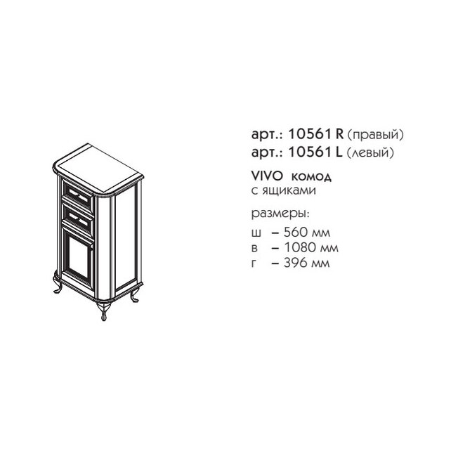 Комод VIVO левый производится в спецотделке B-018, а также в отделках Категории ЭМАЛИ Реестра отделок "CLASSIC" полкой не комплектуется два выдвижных ящика