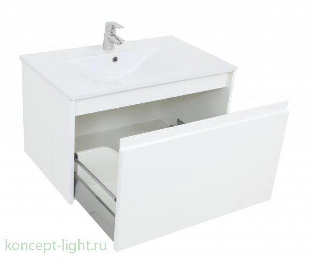 Имеет хорошую эргономику за счет глубины тумбы и скрытого ящика-органайзера, в котором разделение пространства для ванных принадлежностей и аксессуаров.