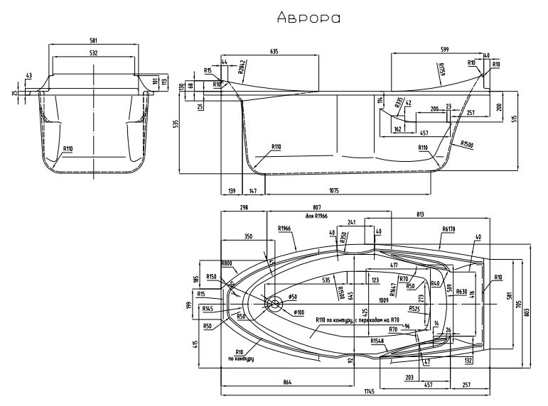 Акриловая ванна «Аврора» создана для практичных, целеустремленных и дерзких людей – она имеет четко очерченные контуры чаши, декор в виде широких волн на передней части бортика и оптимальный набор форсунок для гидромассажа. Рифленая поверхность дна предотвращает скольжение и обеспечивает безопасность того, кто принимает ванну в данный момент. Небольшие подлокотники могут служить опорой для рук. Асимметричная конструкция впишется даже в небольшой санузел, т.к. имеет оптимальную ширину. Если Вам важен не только комфорт и эстетика гидромассажной ванны, но и ее функционал и габариты, то смело выбирайте данную модель.