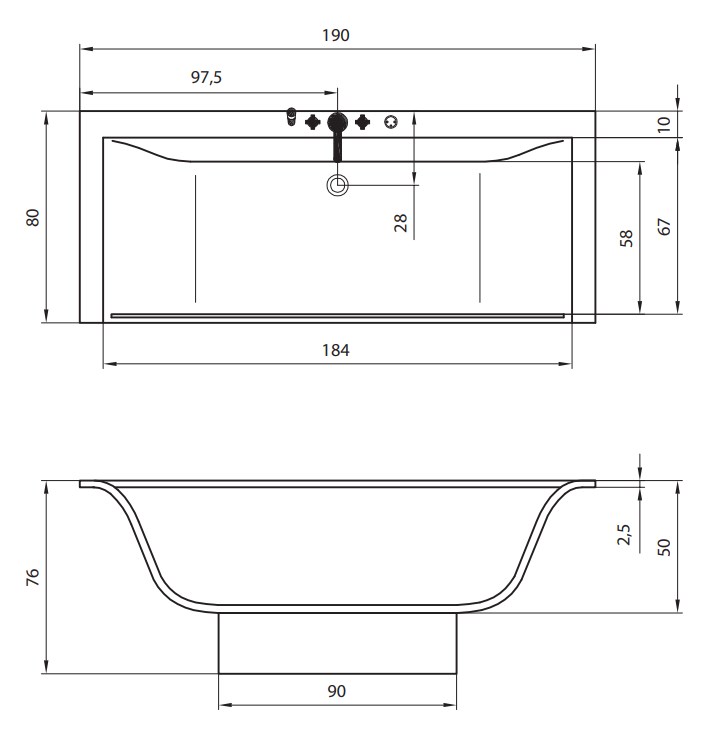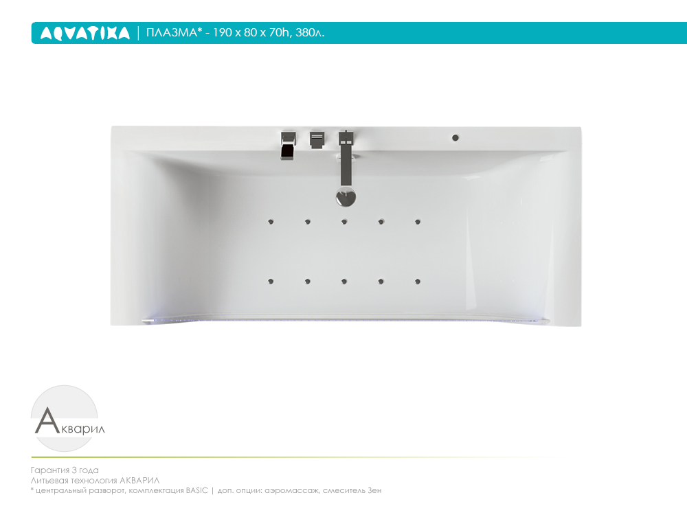 - BASIC (монолит (Акварил), аэромассаж, (сенсорное управление, 10 форсунок), слив-перелив)