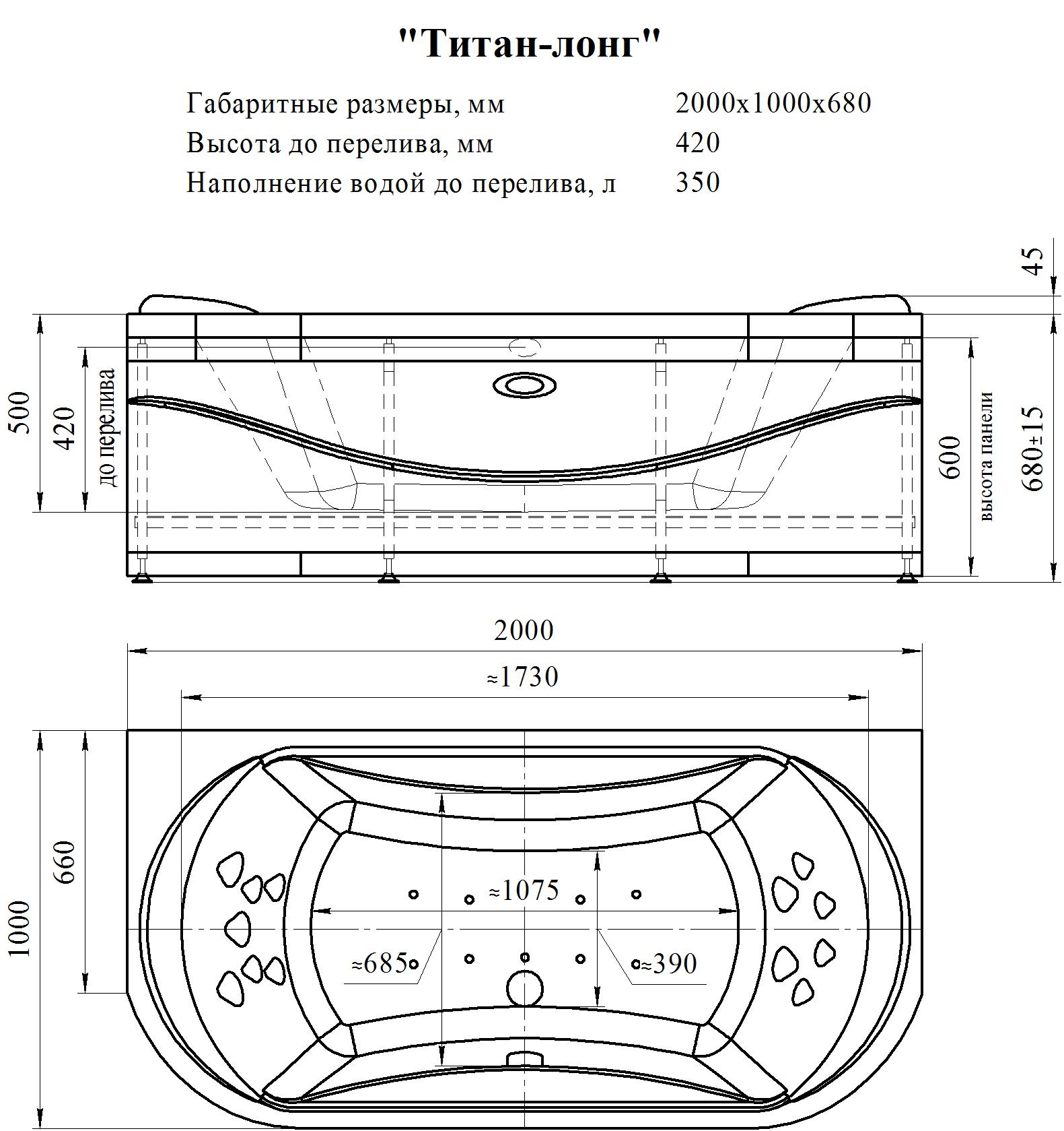 Ванна "Титан-лонг" 200х100 подходит обладателям больших ванных комнат. Ее лаконичная форма – отличное решение для интерьеров современного и премиального дизайна. Ванна 2 метра в длину будет удобна людям высокого роста, для которых размеры стандартных ванн откровенно маловаты. Благодаря просторным габаритам "Титан-лонг" - лучший выбор как ванна для двоих и подарит много приятных минут при совместном купании. А ведь особенно приятно понежиться в теплой воде и ощутить упругие струи гидромассажа не в одиночестве, а, например, в компании любимого человека.
