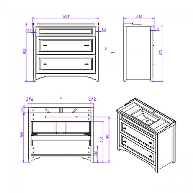 - Габаритные размеры тумба + раковина, ш/г/в, в см: 102,5/47/90,5