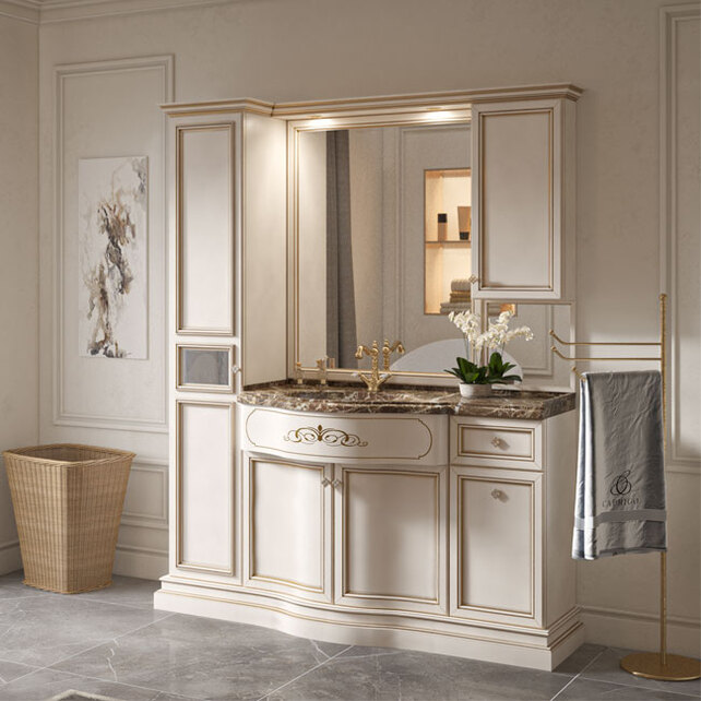 Для формирования комплекта пространство ванной комнаты заполняется по периметру необходимыми модулями. Тумбы и шкафы устанавливаются на основание (цоколь) и накрываются единой столешницей. Над тумбами, в необходимом порядке подвешиваются зеркальные модули и навесные шкафчики. Венчает композицию фигурный карниз, в который монтируются по желанию мебельные светильники.