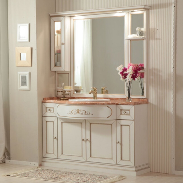 Для формирования комплекта пространство ванной комнаты заполняется по периметру необходимыми модулями. Тумбы и шкафы устанавливаются на основание (цоколь) и накрываются единой столешницей. Над тумбами, в необходимом порядке подвешиваются зеркальные модули и навесные шкафчики. Венчает композицию фигурный карниз, в который монтируются по желанию мебельные светильники.