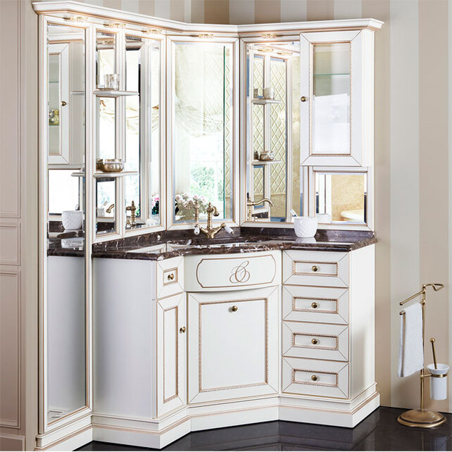 Для формирования комплекта пространство ванной комнаты заполняется по периметру необходимыми модулями. Тумбы и шкафы устанавливаются на основание (цоколь) и накрываются единой столешницей. Над тумбами, в необходимом порядке подвешиваются зеркальные модули и навесные шкафчики. Венчает композицию фигурный карниз, в который монтируются по желанию мебельные светильники.