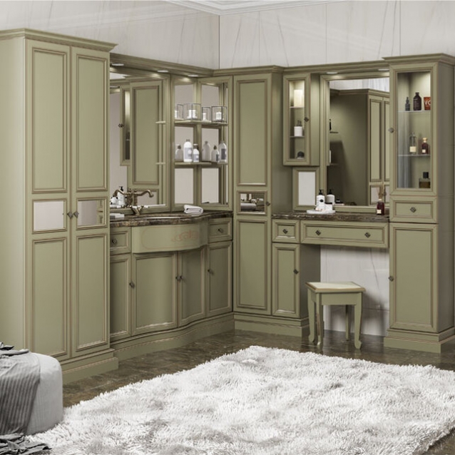 Для формирования комплекта пространство ванной комнаты заполняется по периметру необходимыми модулями. Тумбы и шкафы устанавливаются на основание (цоколь) и накрываются единой столешницей. Над тумбами, в необходимом порядке подвешиваются зеркальные модули и навесные шкафчики. Венчает композицию фигурный карниз, в который монтируются по желанию мебельные светильники.