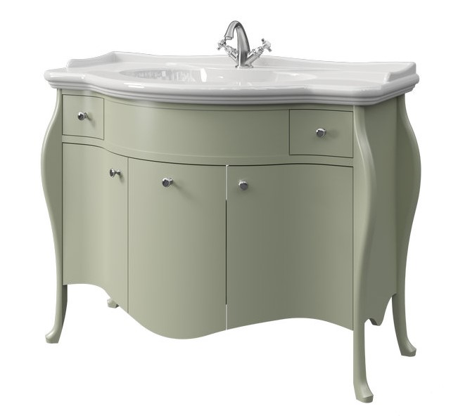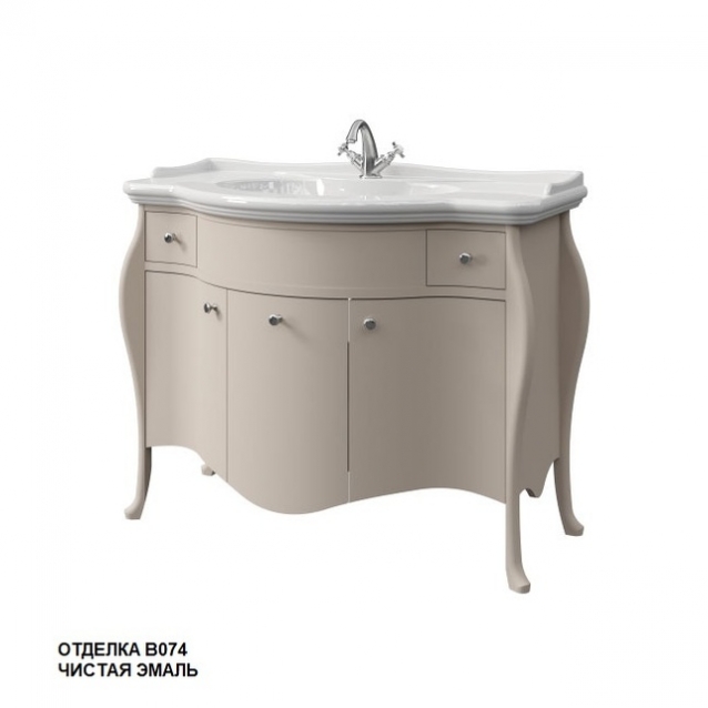 Тумба с раковиной VENEZIA 110 выпускается в отделках из Реестра отделок Classic без патинирования. На выбор две фаянсовые раковины и две стеклянные.Два выдвижных ящика (без направляющих) две стеклянные полки 4 мм