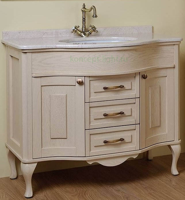 По своим габаритам мебель подходит для просторных ванных комнат. Тумба довольно вместительная – она состоит из полочек за распашными дверцами и выдвижных ящиков. Устанавливается на пол, а фасады обработаны специальным влагостойким покрытием.