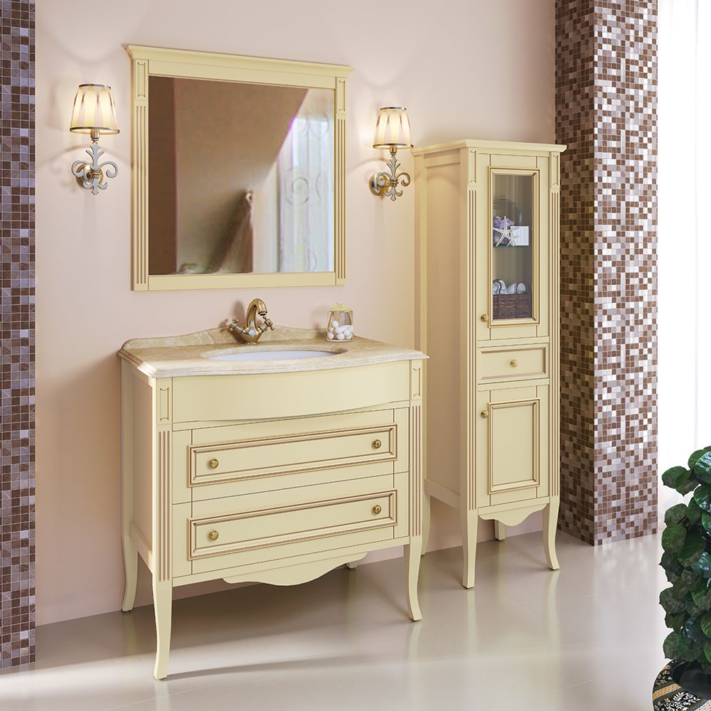 Финская мебель для ванной комнаты TIMO Aura 90 M-V (A-B) - стильный вариант мебели для Вашей ванной комнаты. Выполненный в классическом стиле и в цвете ваниль (avorio) с золотом комплект гармонично впишется в любой интерьер.