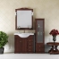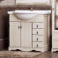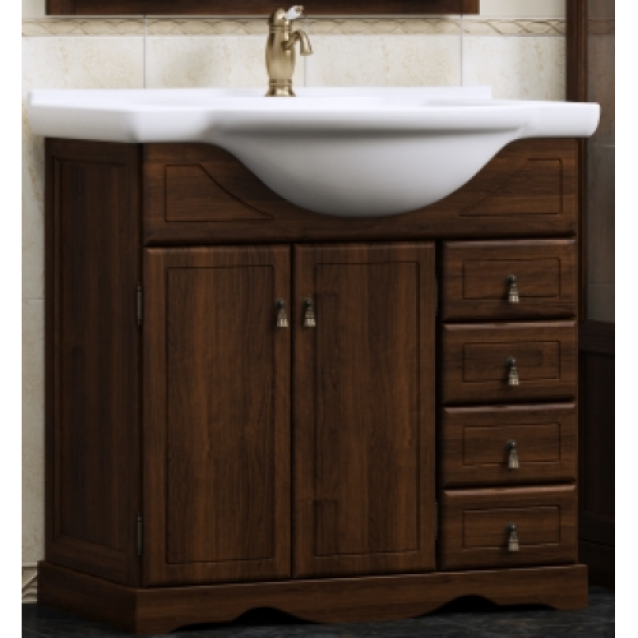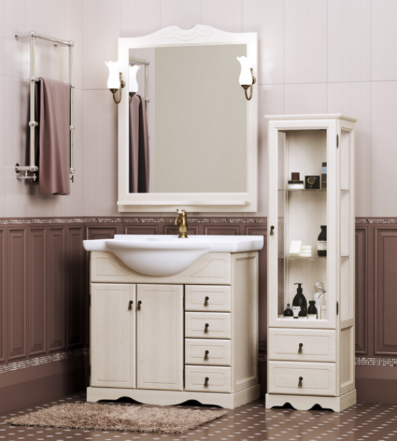 Комплект состоит из зеркала в деревянной раме с двумя изящными светильниками и полочкой, тумбы с двумя открывающимися фасадами, четырьмя выдвижными ящиками и керамической раковины «Дрея» (Чехия). По желанию, комплект дополняется угловым или обычным пеналом, удобными подвесными шкафчиками и напольной тумбой.