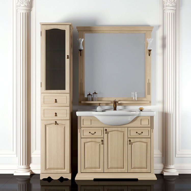 Гарнитур Opadiris Риспекто 95 в белом цвете можно заказать в двух вариантах. Базовый вариант предполагает наличие в комплекте тумбы из массива бука, керамической раковины, зеркала в раме с полкой и пары светильников. Можно купить мебель для ванной Opadiris Риспекто в расширенной комплектации, которая включает базовый вариант + напольный пенал с полками и ящиками.
