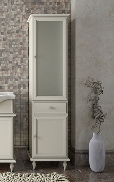 Пенал Opadiris Санрайз в классическом дизайне из массива бука, выполнен в цвете слоновой кости и оформлен матовым стеклом. Прямоугольная конструкция изделия на изящных фигурных ножках предусматривает сверху и снизу декоративный ступенчатый плинтус, который переплетается по стилистике с обработкой рамных фасадов. Функциональные зоны пенала представлены двумя отделениями с полками и одним выдвижным ящиком. Возможно исполнение в левостороннем и правостороннем виде, необходимый вариант нужно уточнить при заказе.