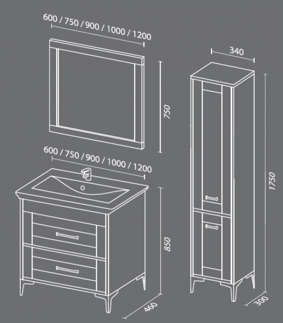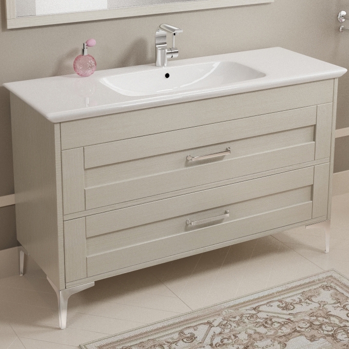 Комплект мебели выполнен в классическом стиле. Оснащен двумя выдвижными ящиками с функцией полного выдвижения и плавного, бесшумного закрывания. Хромированные нерегулируемые опоры. Наборный фасад. Модель производится в плёнке ПВХ.