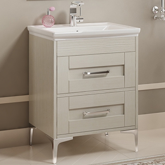 Комплект мебели выполнен в классическом стиле. Оснащен двумя выдвижными ящиками с функцией полного выдвижения и плавного, бесшумного закрывания. Хромированные нерегулируемые опоры. Наборный фасад. Модель производится в плёнке ПВХ.