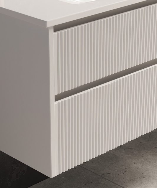 Ещё одна отличительная черта дизайна этой тумбы — восхитительная игра теней на фасадах, созданная объемной фрезеровкой.