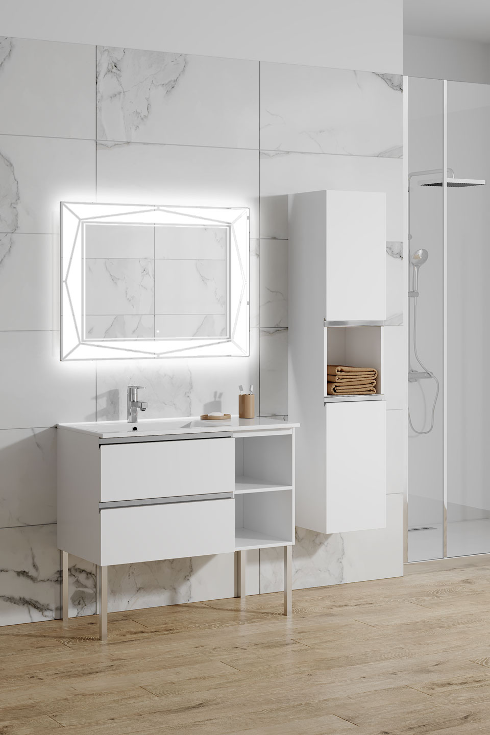Напольная тумба с двумя ящиками и двумя полками, оснащена системой полного выдвижения и плавного закрывания.