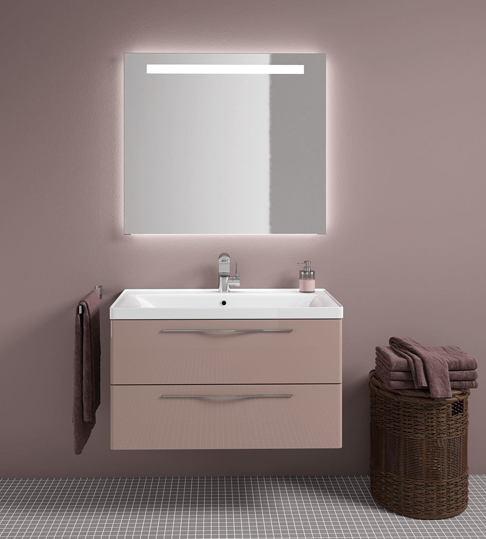 Модель выполнена в современном стиле. Укомплектована двумя выдвижными ящиками с механизмами плавного закрывания. Изящная полувстроенная ручка во всю длину фасада. Раковина – керамика. Зеркало со встроенным LED-светильником