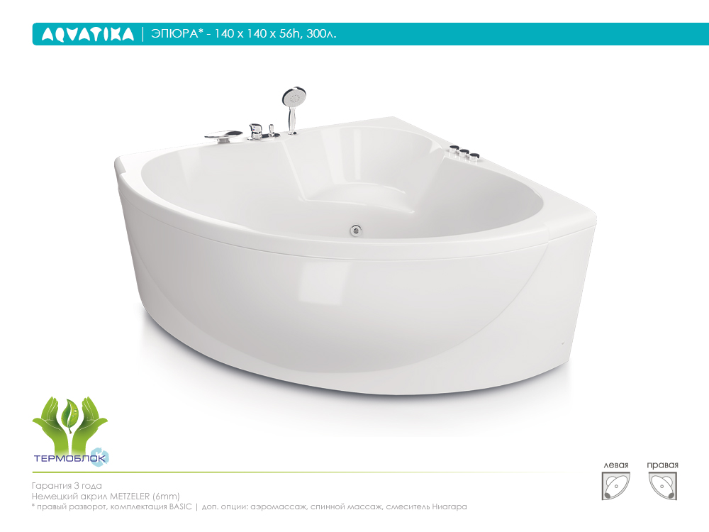 Круг сторонников гидромассажа становится все шире, а выбор акриловых ванн – все больше. Угловая модель «Эпюра», вмещающая 300 л воды, идеально впишется в Вашу жизнь. Симметричная форма изделия продиктована не только требованиями эстетики, но и функциональностью. Ванна идеально заполнит угол помещения, заняв минимум площади. Овальная форма внутренней чаши позволит пользователю принять самое комфортное положение. В угловой части предусмотрено глубокое сиденье, а на дне и боковых поверхностях могут быть установлены форсунки, подающие упругие струи воды для массажа тела. Купив модель «Эпюра», Вы легко превратите собственную ванную в домашний спа-салон. Система гидро- и аэромассажа окажет тонизирующее действие и поможет снять стресс и усталость.