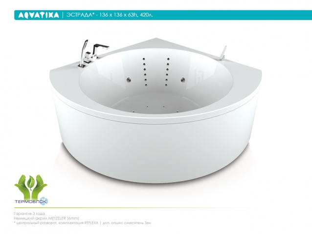 Акриловая ванна «Эстрада» создана специально для тех, кто хочет иметь максимальный комфорт в любой ситуации. Круглая глубокая чаша обеспечивает свободу передвижения, а гидромассажные форсунки с управляемым напором воды мягко массируют мышцы спины, шеи и бедер, расслабляя тело и повышая настроение. На бортиках закреплены блестящие смеситель и душевая лейка, которые превращают обычное купание в торжественный обряд. Удобная форма позволяет установить чашу в любой угол санузла, открывая дополнительную свободную площадь. Данная гидромассажная ванна станет отличным дополнением для тех, кто выбирает для себя все самое лучшее!