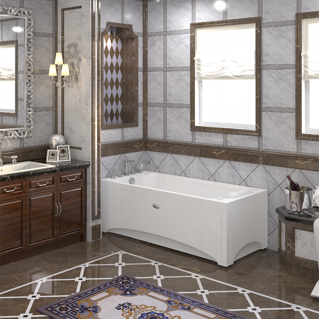 Акриловая ванна "Уэльс" 170х75 – модель с благородным аристократичным дизайном. Ванна имеет прямоугольную форму, а в отделке панелей преобладает классический стиль. В качестве изящного дополнения можно украсить ванну декоративными вставками "Кристаллы Swarovski" и "Арт-мозаика".